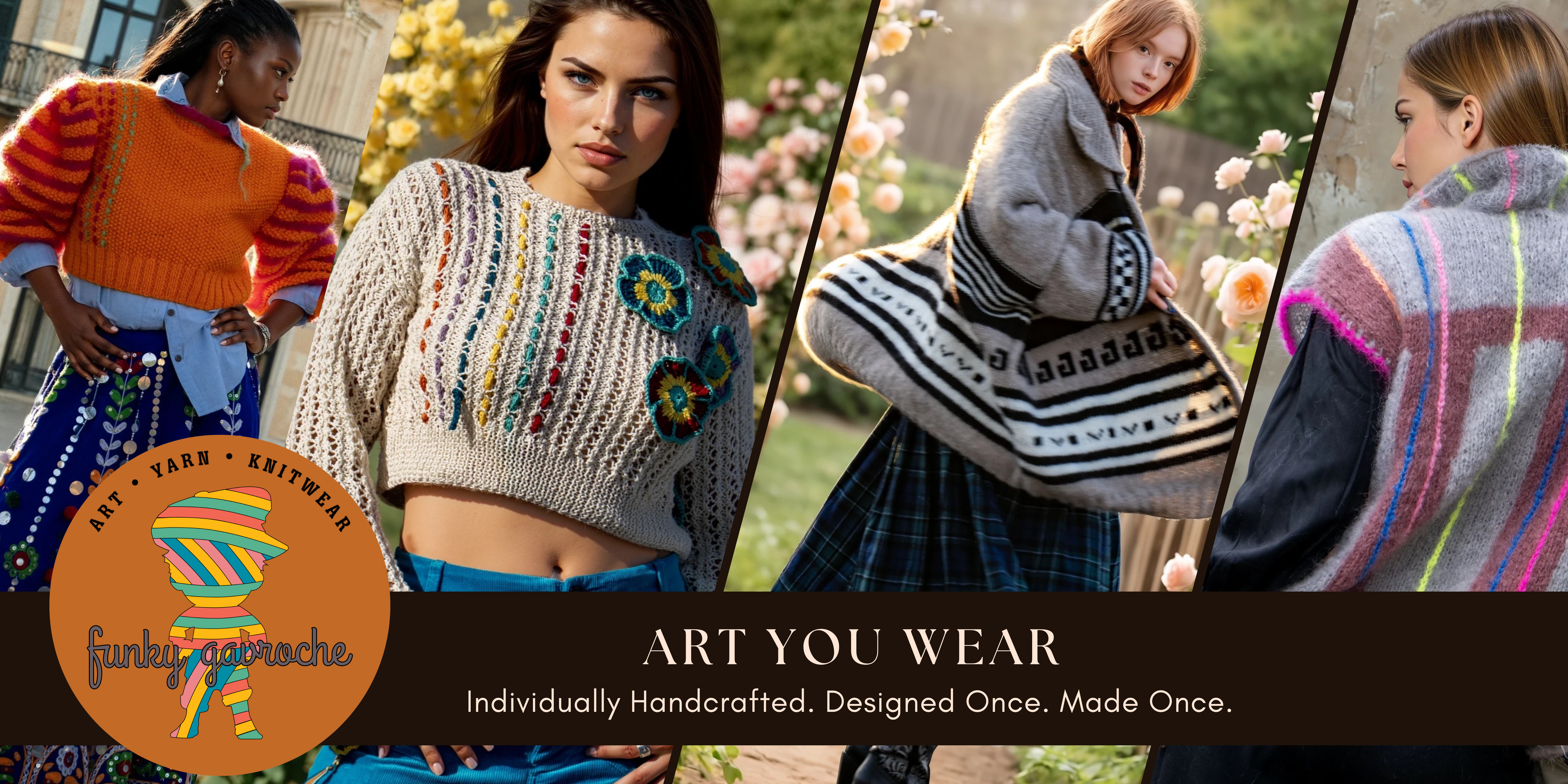 Funky Gavroche is a slow-fashion brand founded by designer Clara Jacobs, creating hand-crocheted, one-of-a-kind wearable art. Each piece is made entirely by hand, blending traditional craftsmanship with bold color, texture, and modern silhouettes.
