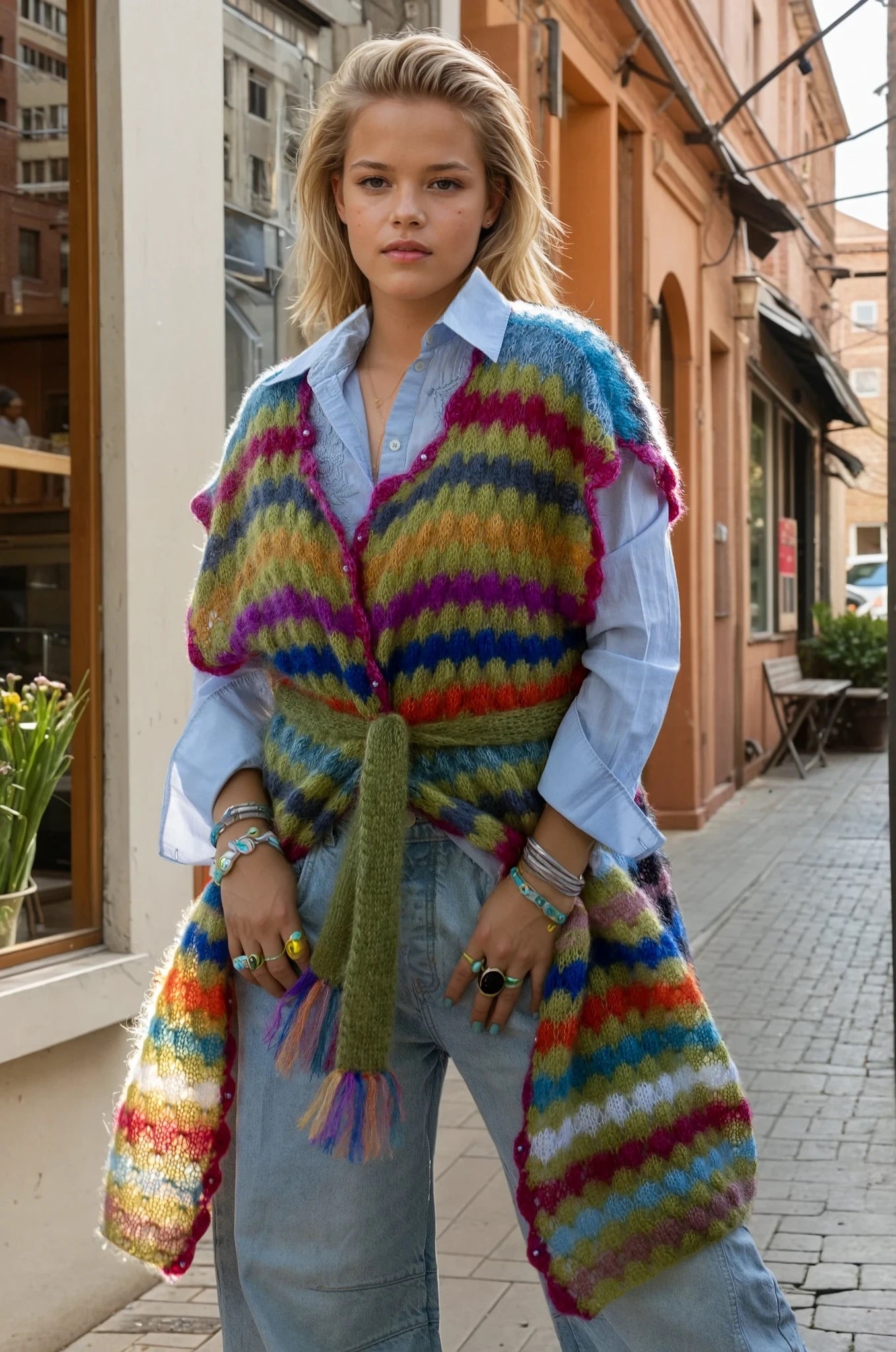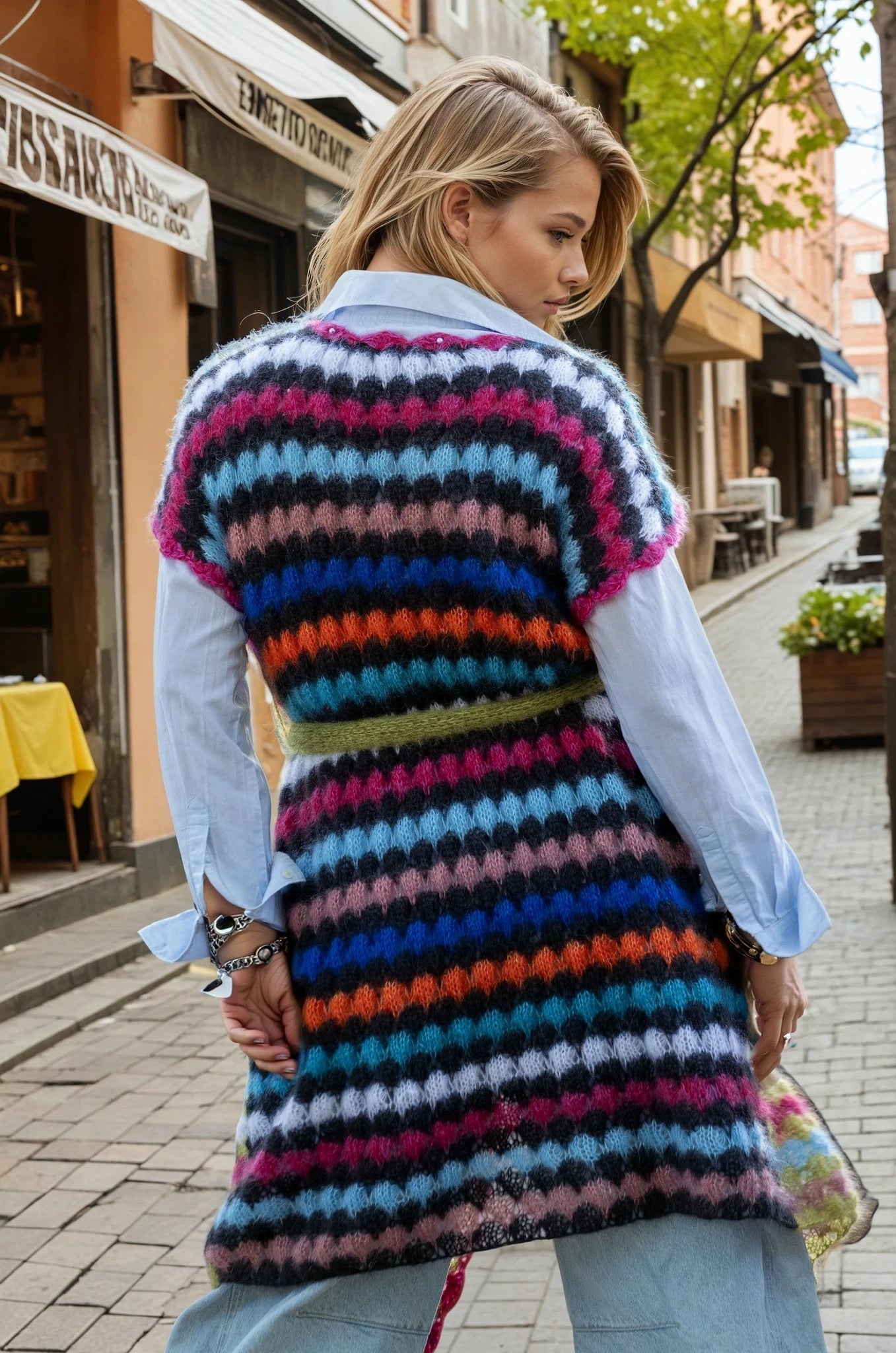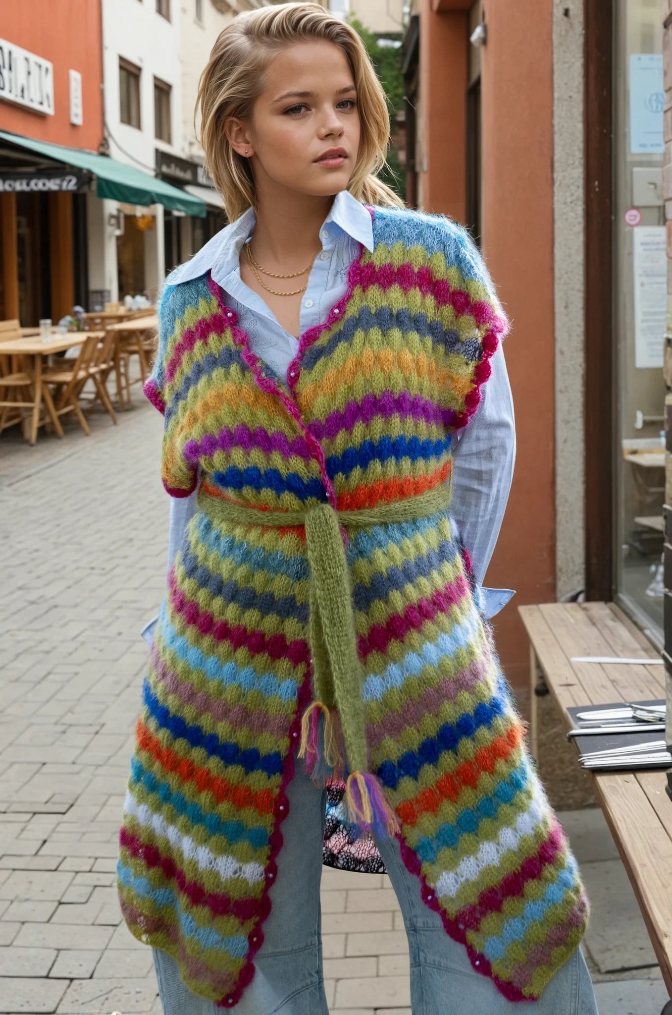 This handmade vest is a stunning statement piece crafted from luxurious, fluffy silk mohair. Featuring an original and artistic design, it showcases a vibrant palette of eclectic stripes that blend bold colors with a soft, tactile texture. The vest’s open-front silhouette, finished with a matching knit belt and delicate edging, adds both structure and fluidity, making it a versatile layering piece. Perfect for those with a creative spirit, this wearable art effortlessly bridges the gap between cozy comfort and high-impact style.