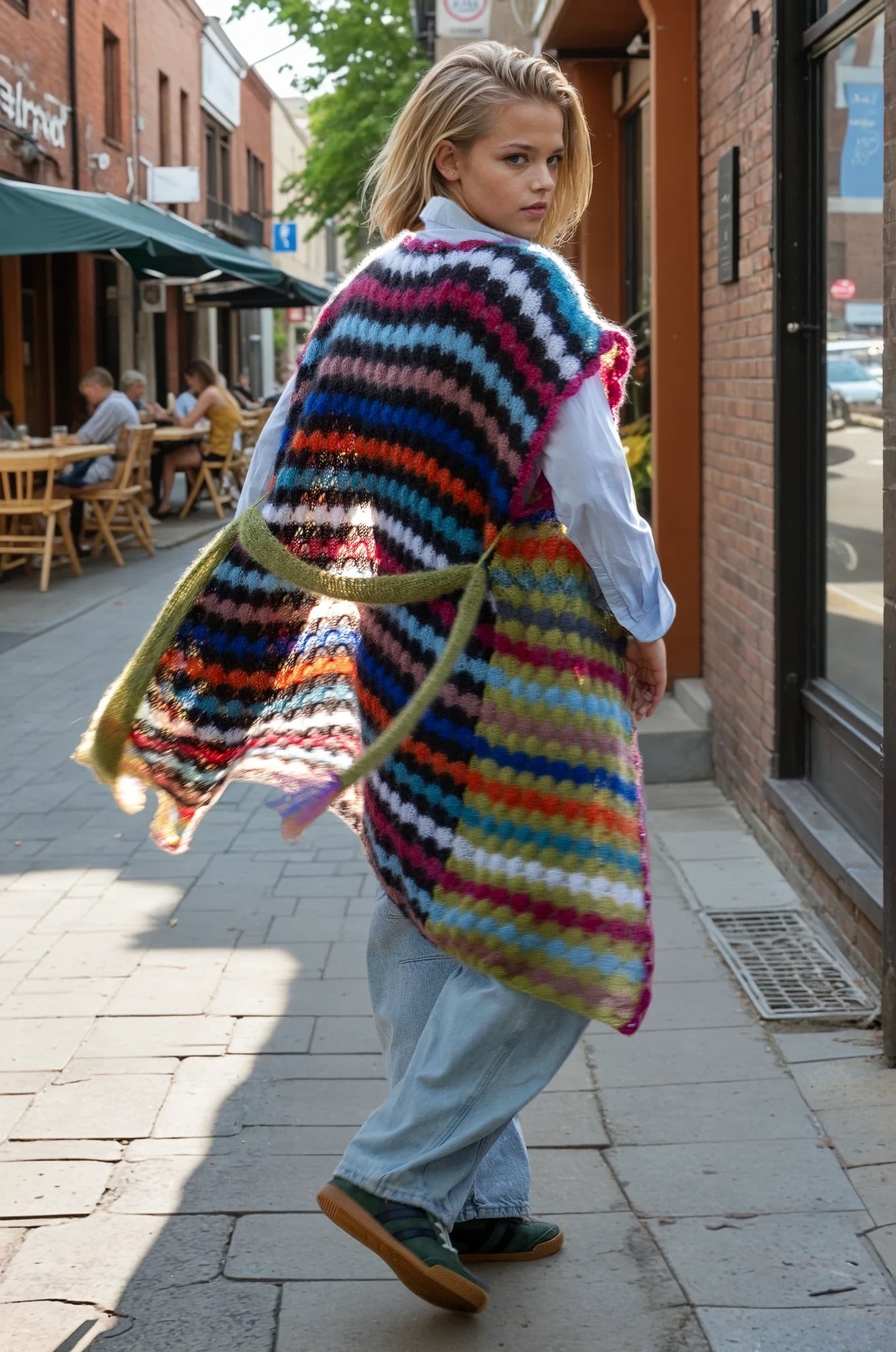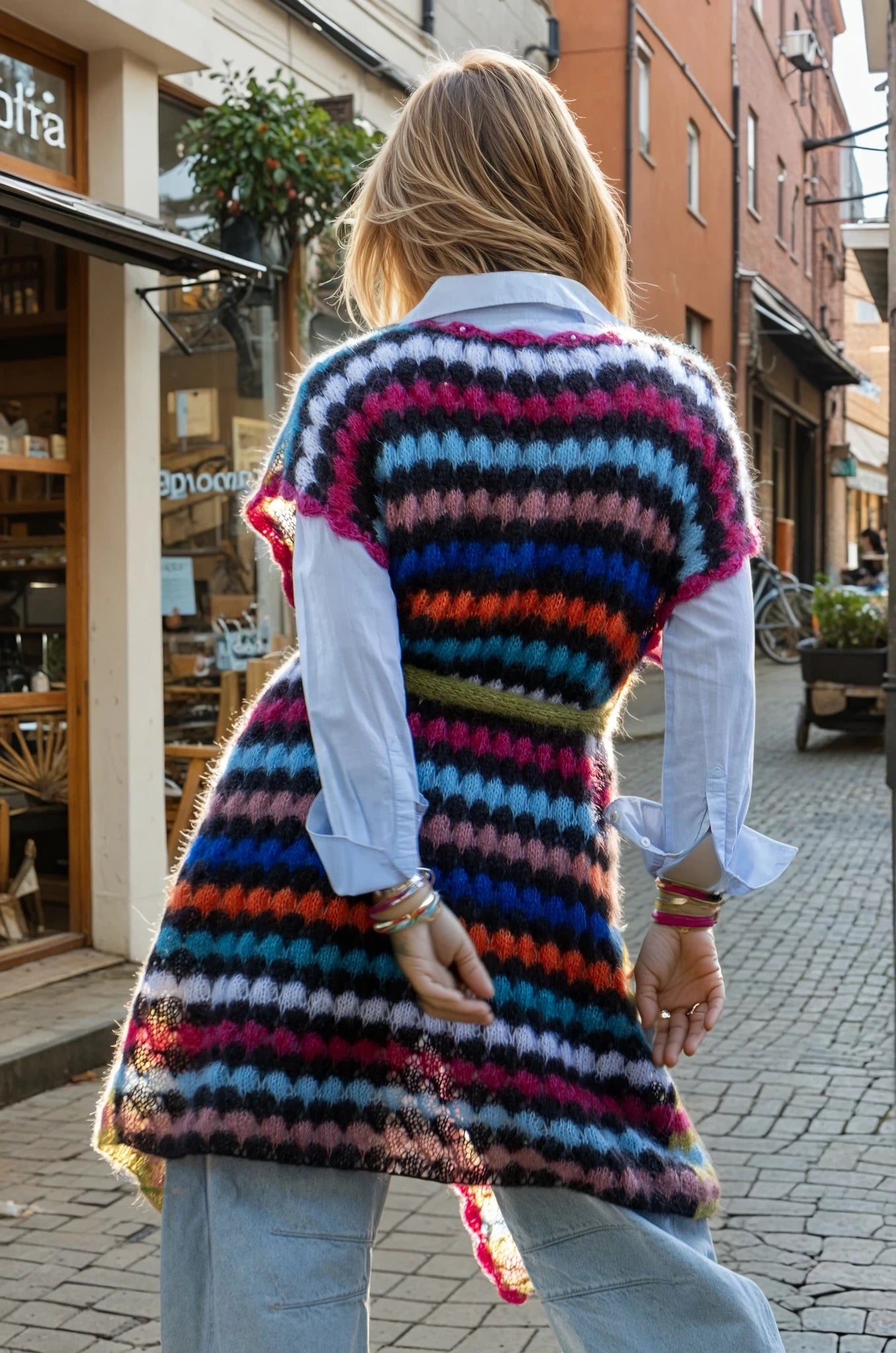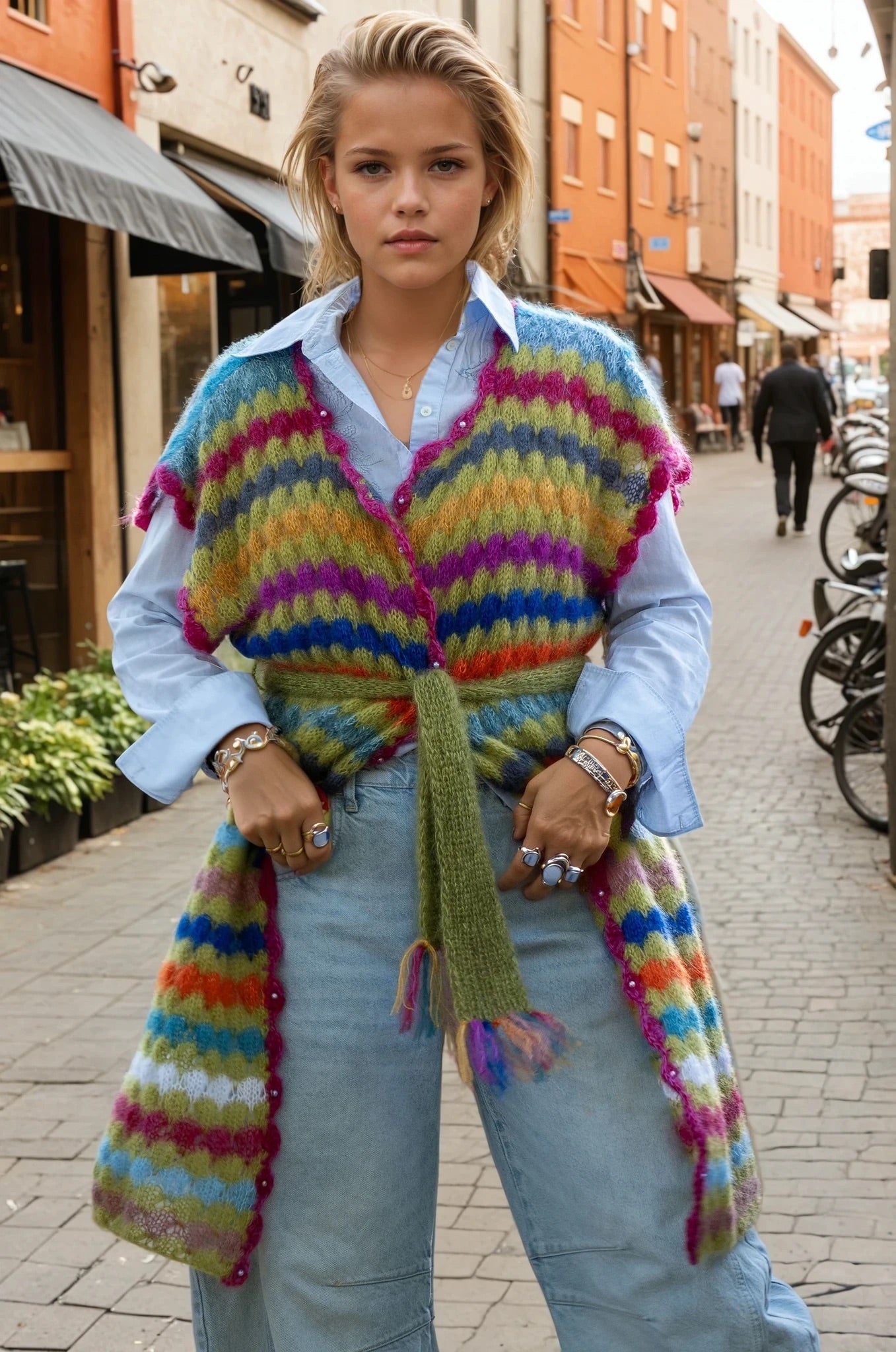 This handmade vest is a stunning statement piece crafted from luxurious, fluffy silk mohair. Featuring an original and artistic design, it showcases a vibrant palette of eclectic stripes that blend bold colors with a soft, tactile texture. The vest’s open-front silhouette, finished with a matching knit belt and delicate edging, adds both structure and fluidity, making it a versatile layering piece. Perfect for those with a creative spirit, this wearable art effortlessly bridges the gap between cozy comfort and high-impact style.